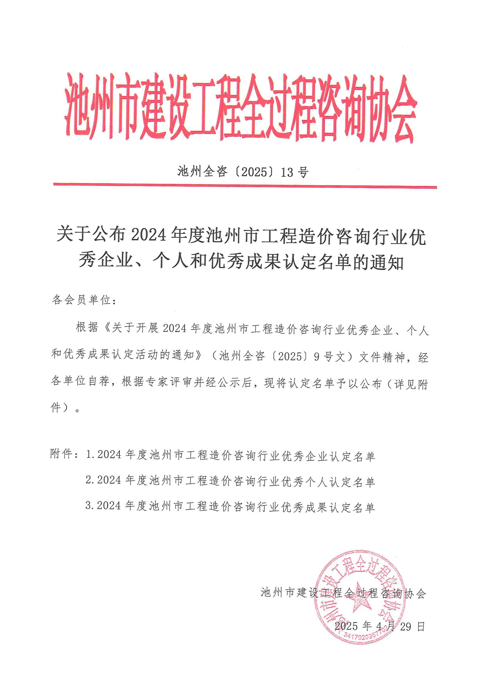 根据《关于开展2024年度池州市工程造价咨询行业优秀企业、个人和优秀成果认定活动的通知》【池州全咨(2025)9号文】文件精神,经各单位自荐,根据专家评审并经公示后,现将认定名单予以公布(详见附件)。
