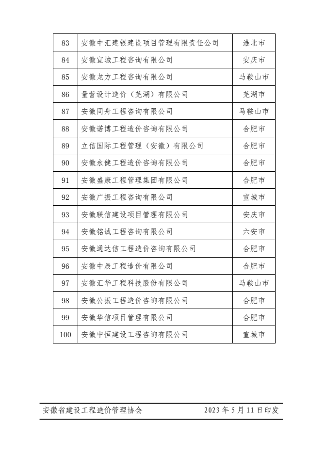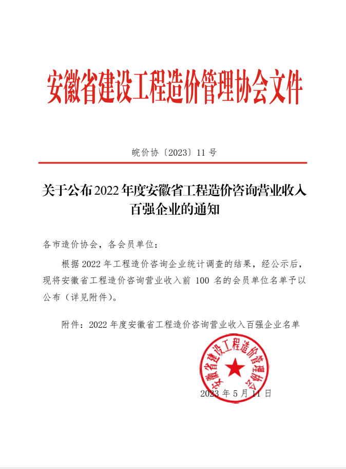 关于公布2022年度安徽省工程造价咨询营业收入百强企业的通知