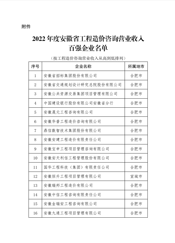 附件:2022年度安徽省工程造价咨询营业收入百强企业名单