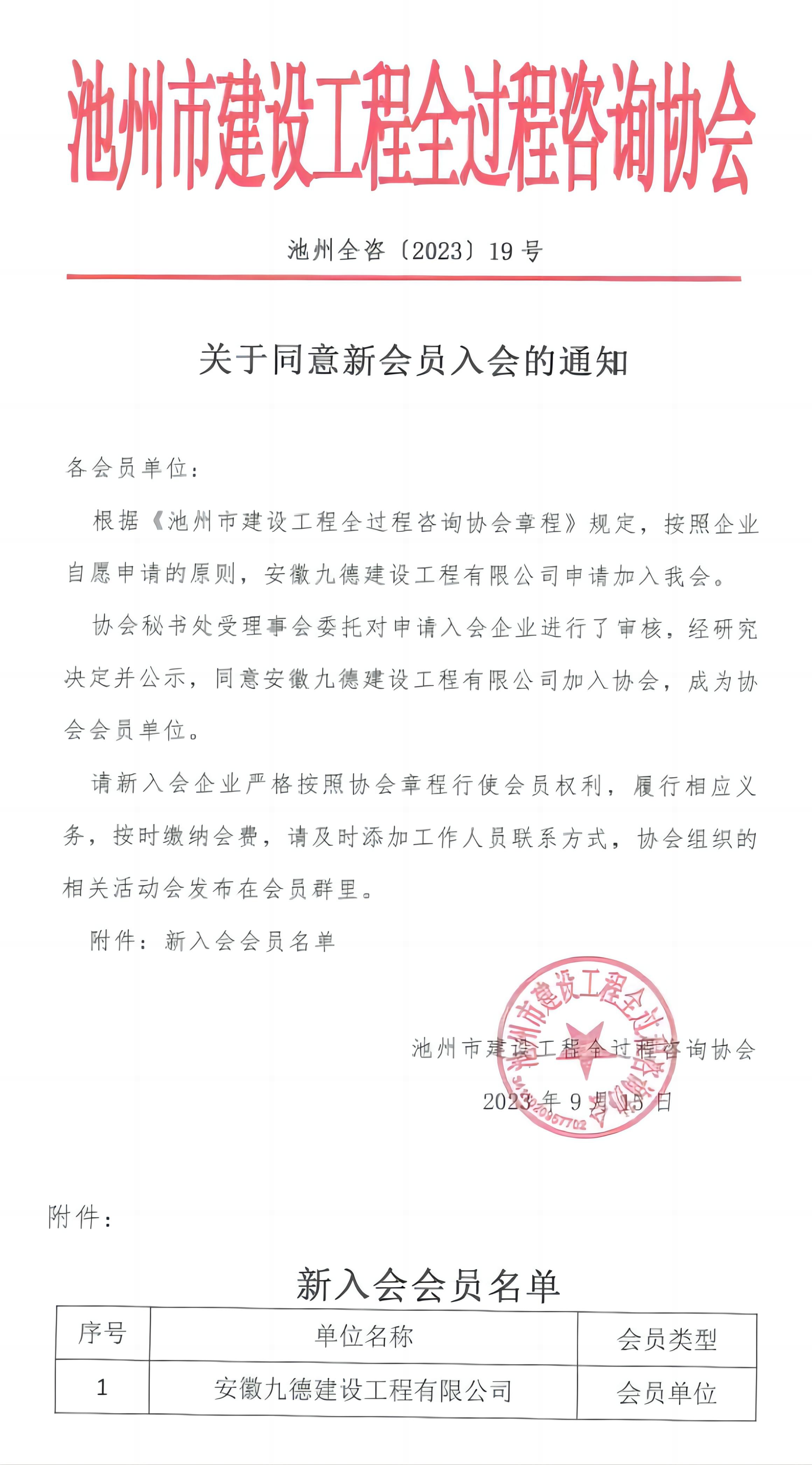 根据《PA视讯章程》规定,按照企业自愿申请的原则,安徽九德建设工程有限公司申请加入我会。PA视讯秘书处受理事会委托对申请入会企业进行了审核,经研究决定并公示,同意安徽九德建设工程有限公司加入PA视讯,成为PA视讯会员单位。请新入会企业严格按照PA视讯章程行使会员权利,履行相应义务,按时缴纳会费,请及时添加工作人员联系方式,PA视讯组织的相关活动会发布在会员群里。