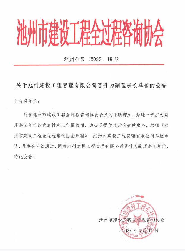 关于池州建投工程管理有限公司晋升为副理事长单位的公告