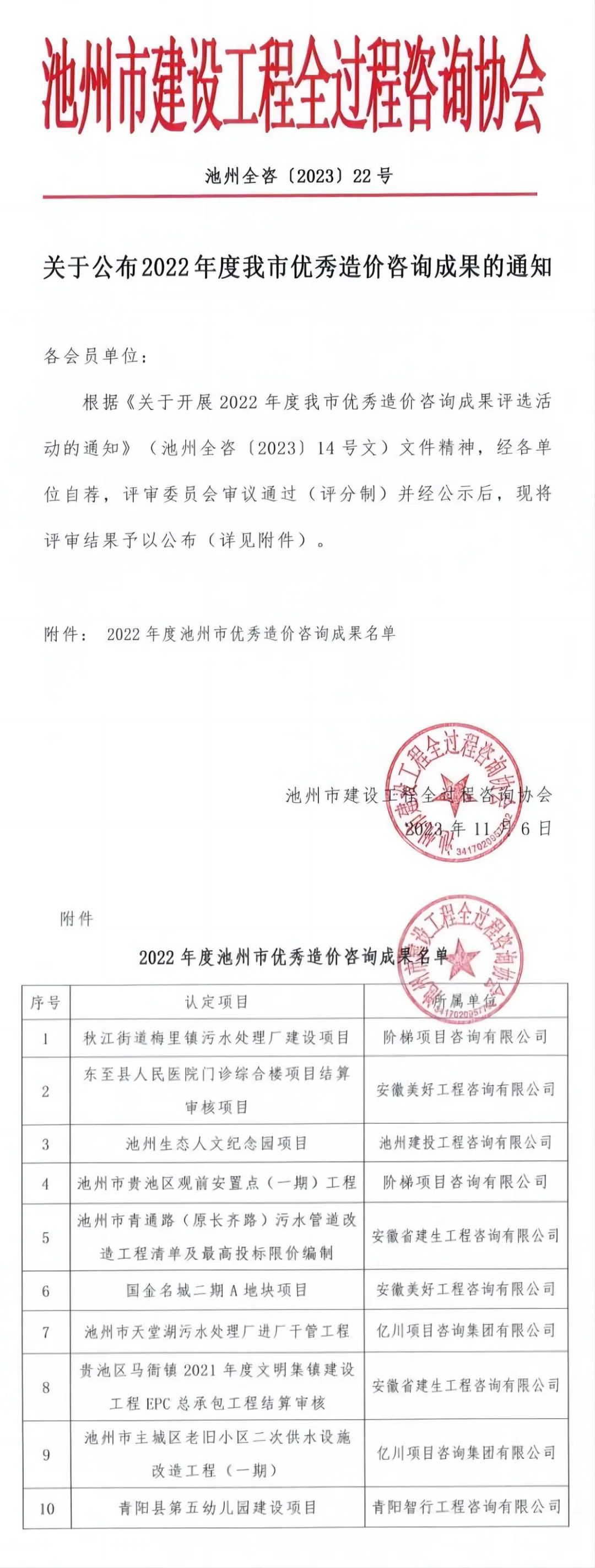 根据《关于开展2022年度我市优秀造价咨询成果评选活动的通知》(池州全咨〔2023〕14号文)文件精神,经各单位自荐,评审委员会审议通过(评分制)并经公示后,现将评审结果予以公布(详见附件)。