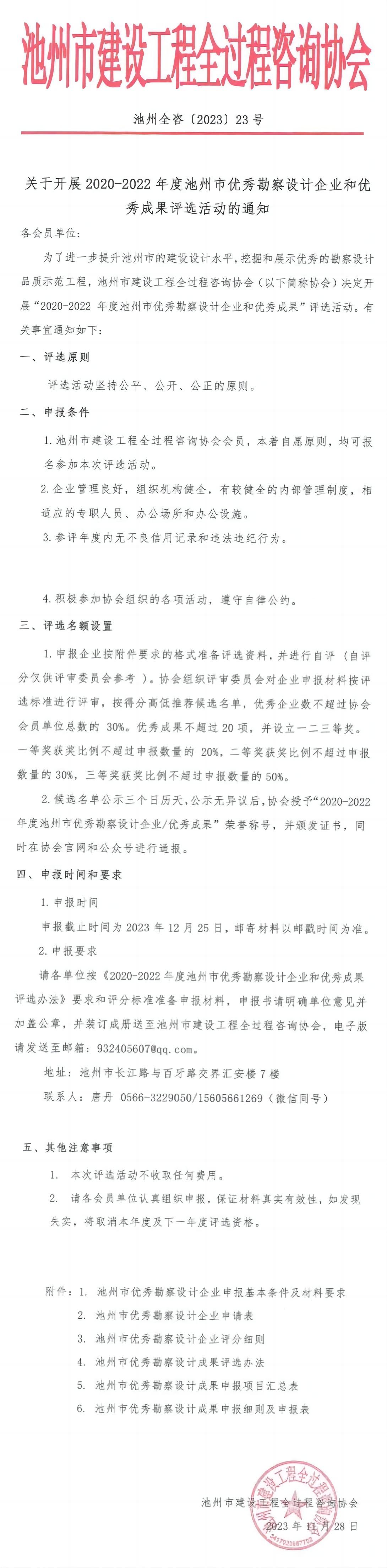 请各单位按《2020-2022年度池州市优秀勘察设计企业和优秀成果评选办法》要求和评分标准准备申报材料,申报书请明确单位意见并加盖公章,并装订成册送至PA视讯,电子版请发送至邮箱:932405607@qq.com。