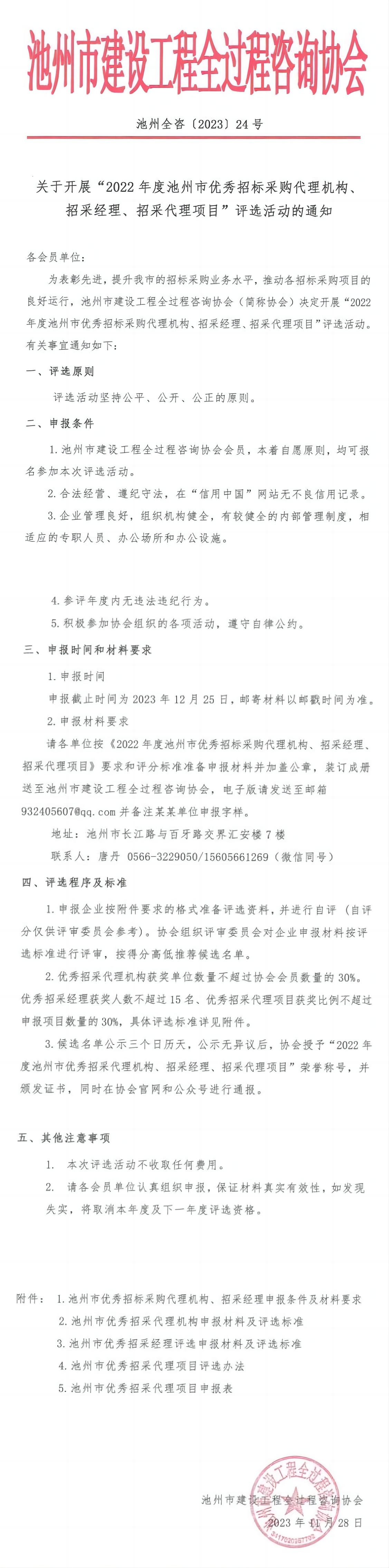 请各单位按《2022年度池州市优秀招标采购代理机构、招采经理、招采代理项目》要求和评分标准准备申报材料并加盖公章,装订成册送至PA视讯,电子版请发送至邮箱932405607@qq.com并备注某某单位申报字样。