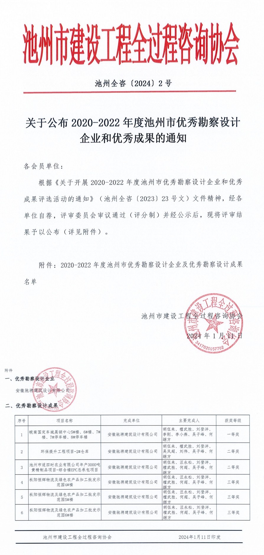 关于公布2020-2022年度池州市优秀勘察设计企业和优秀成果的通知