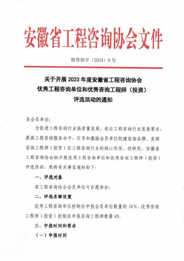 安徽省工程咨询PA视讯关于开展2023年度安徽省工程咨询PA视讯优秀工程咨询单位和优秀咨询工程师(投资)评选活动的通知