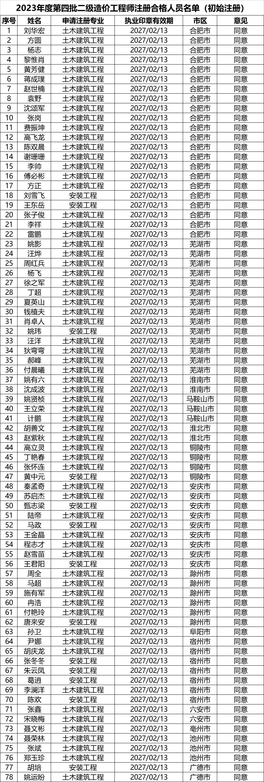 根据《注册造价工程师管理办法》(原建设部令第150号)、《关于安徽省二级造价师注册管理有关事项的通知》(建人函〔2020〕682号)等相关规定,经审核,刘华宏等78人符合二级造价工程师初始注册条件,现予公布。