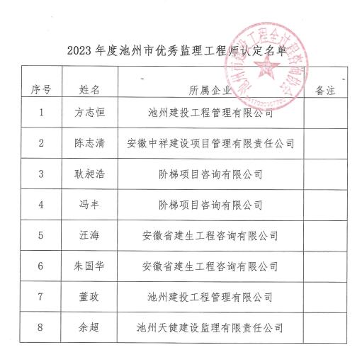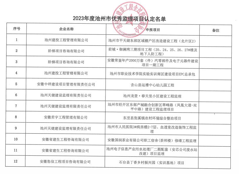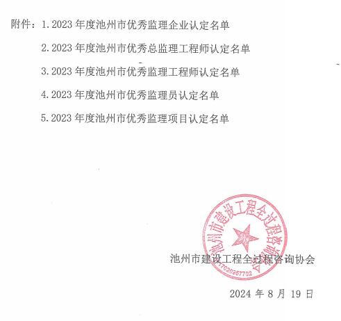 根据《关于开展2023年度我市优秀监理企业、个人、项目评选活动的通知》(池州全咨〔2024〕16号文)文件精神,经各单位自荐,评审委员会审议通过,现将评审结果予以公示(详见附件)。公示期自2024年8月16日起至2024年8月21日止。公示期间,如有异议,请向PA视讯秘书处书面反映。