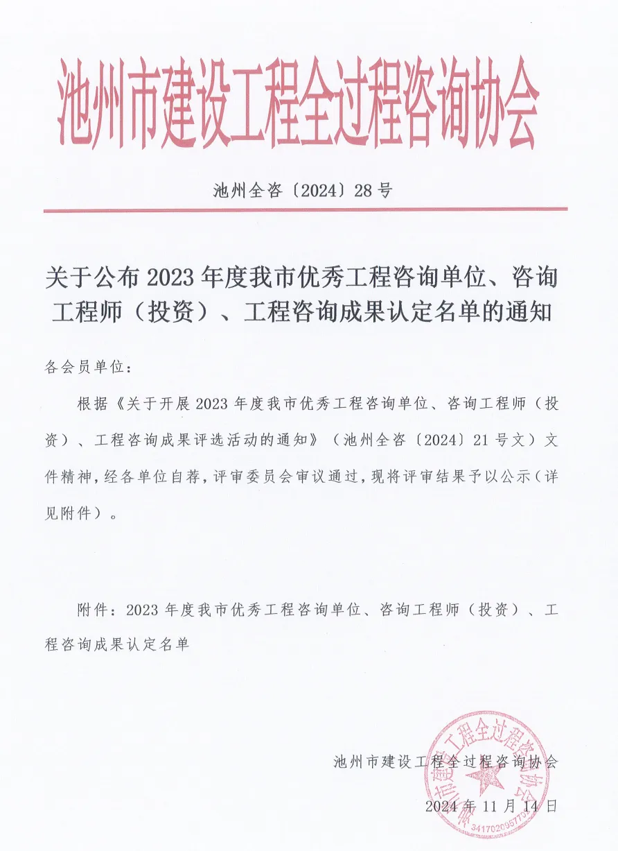 根据《关于开展2023年度我市优秀工程咨询单位、咨询工程师(投资)、工程咨询成果评选活动的通知》(池州全咨〔2024〕21号文)文件精神,经各单位自荐,评审委员会审议通过,现将评审结果予以公示(详见附件)。