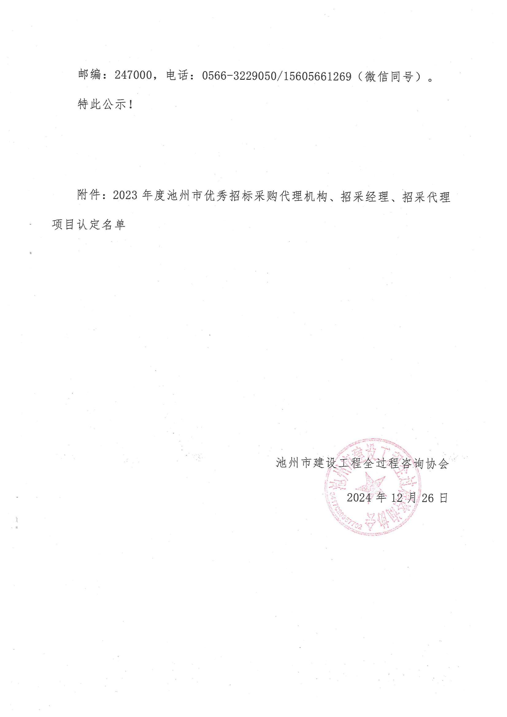 根据《关于开展2023年度池州市优秀招标采购代理机构、招采经理、招采代理项目评选活动的通知》(池州全咨〔2024〕26号文)文件精神,经各单位自荐,评审委员会审议通过(评分制),现将认定名单予以公示(详见附件)。 公示期为2024年12月26日至2024年12月30日三个工作日。