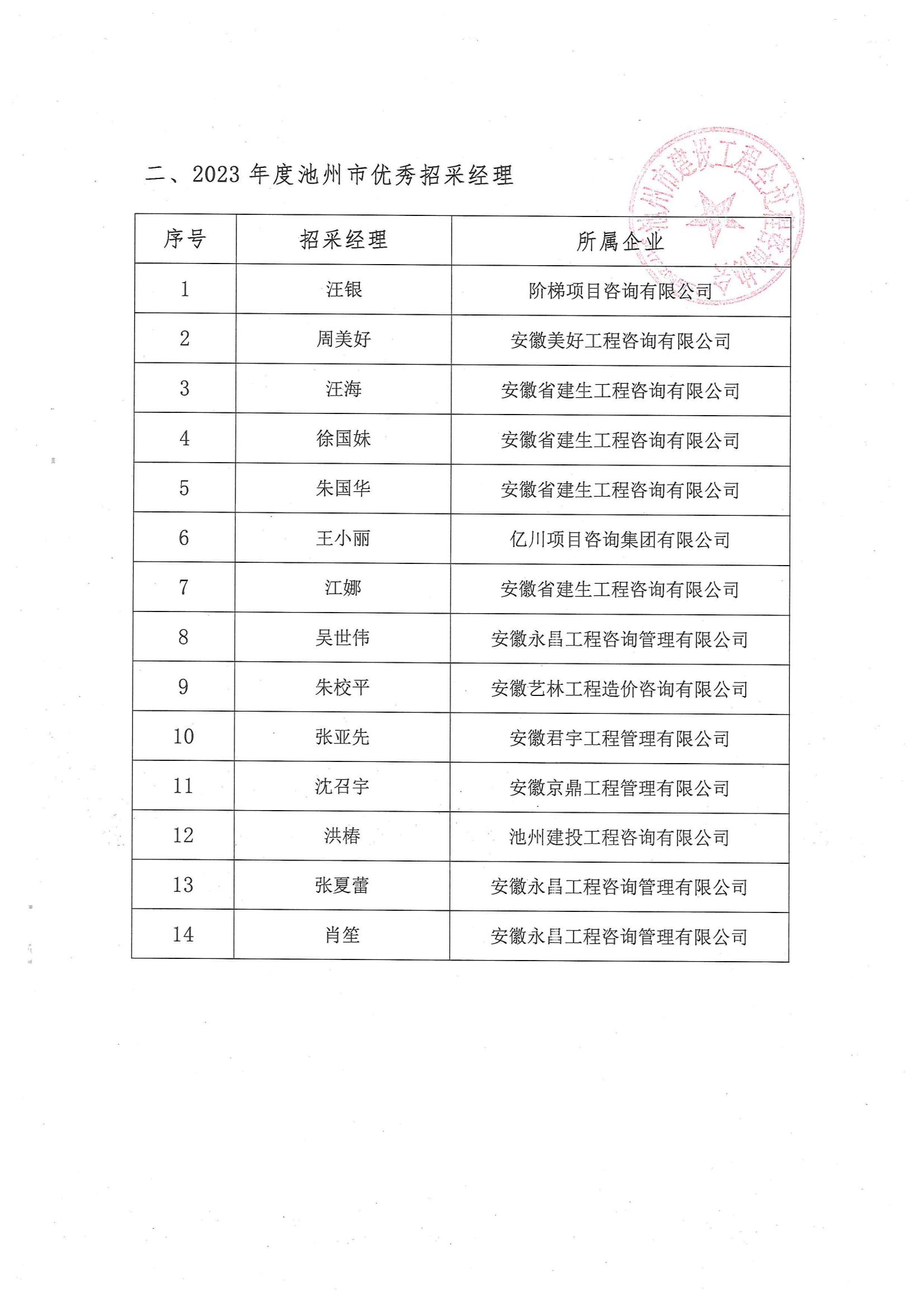 2023年度池州市优秀招标采购代理机构、招采经理、招采代理项目认定名单的公示