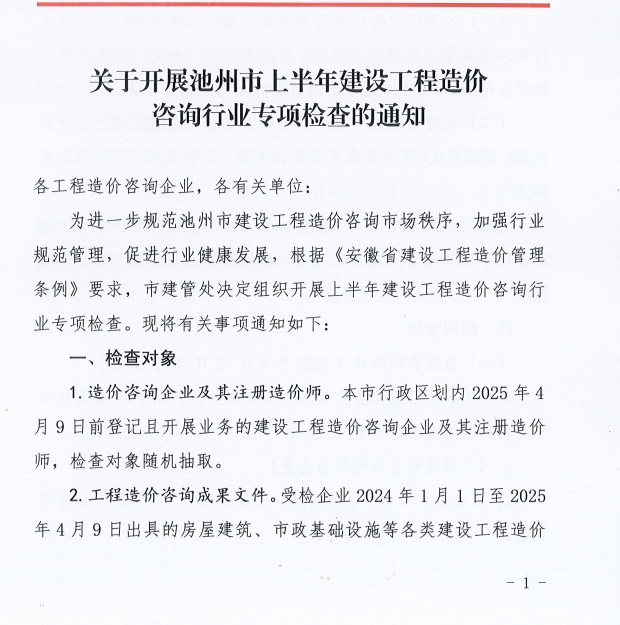 池州市建管处关于开展池州市上半年建设工程造价咨询行业专项检查的通知