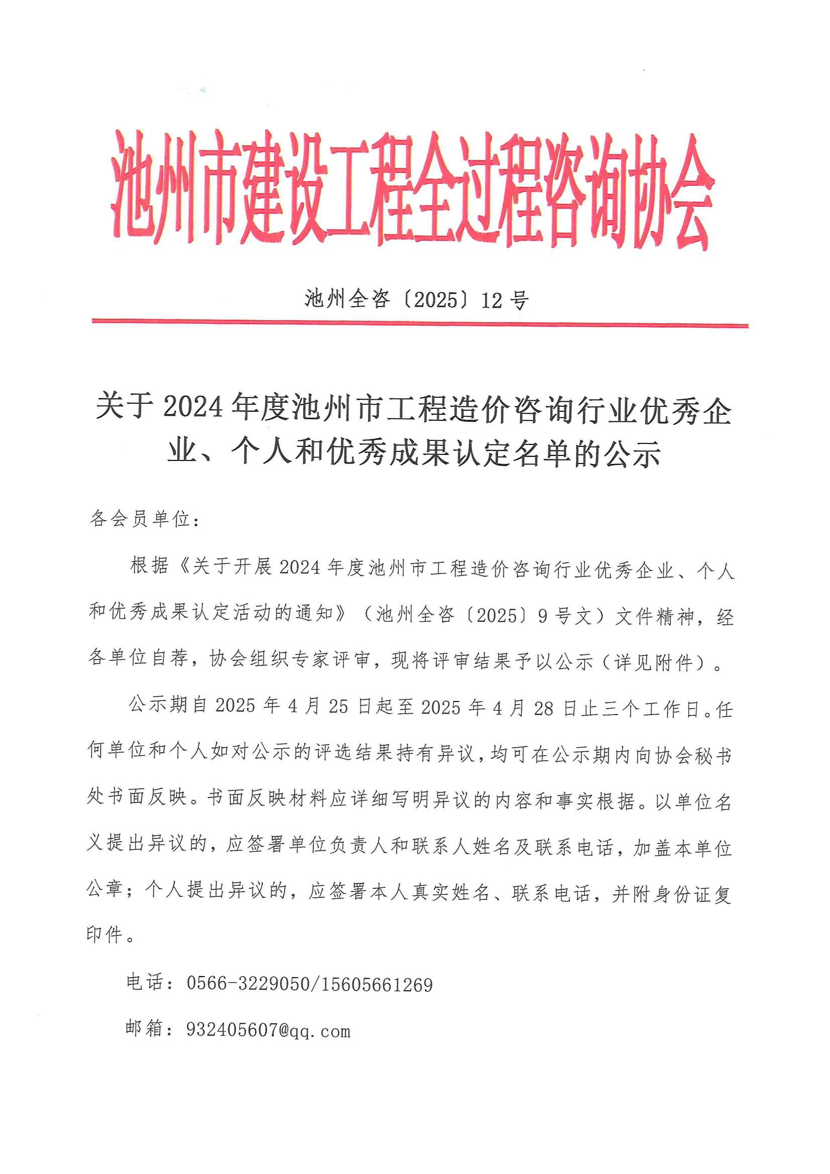 根据《关于开展2024年度池州市工程造价咨询行业优秀企业、个人和优秀成果认定活动的通知》(池州全咨〔2025〕9号文)文件精神,经各单位自荐,PA视讯组织专家评审,现将评审结果予以公示(详见附件)。