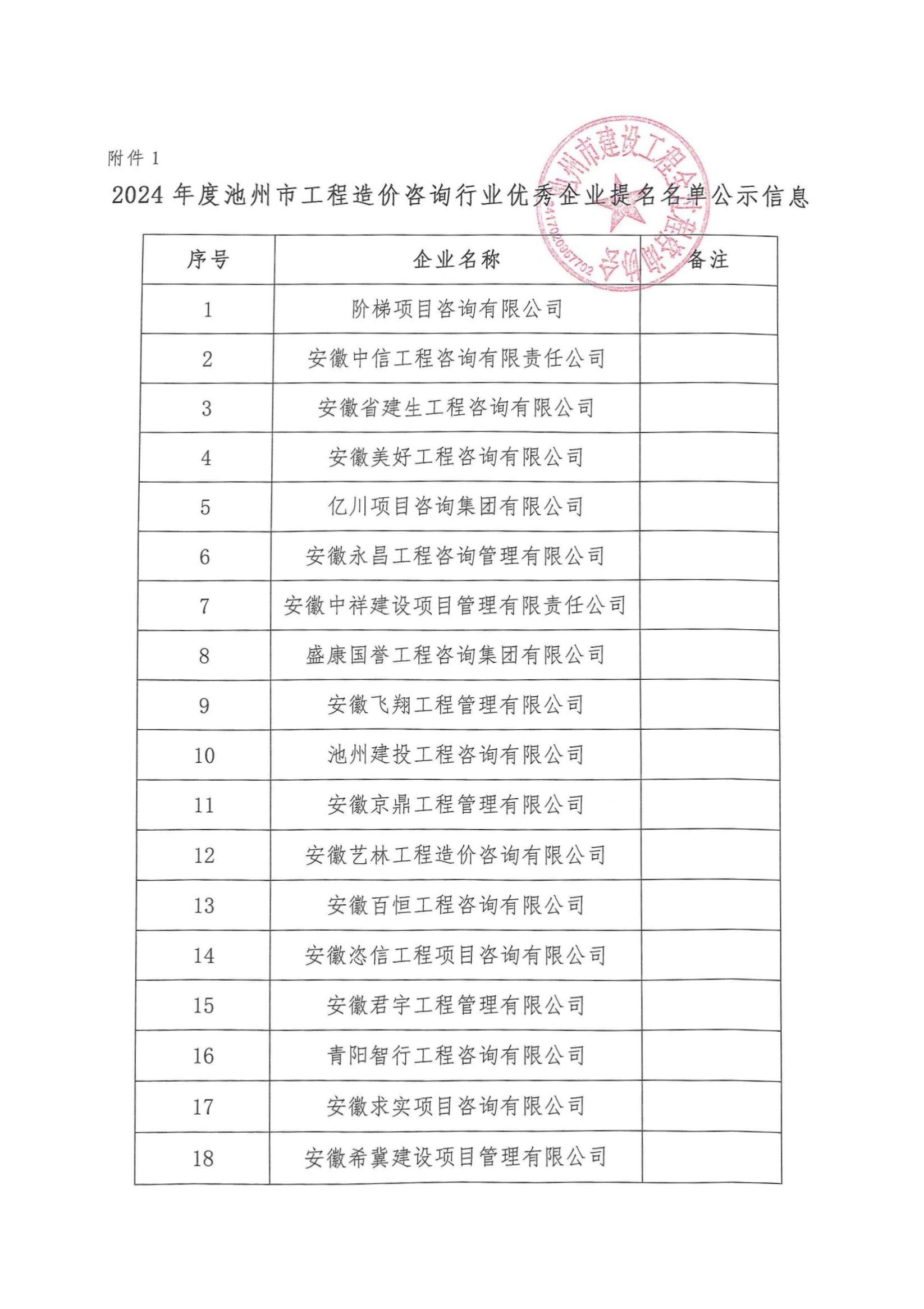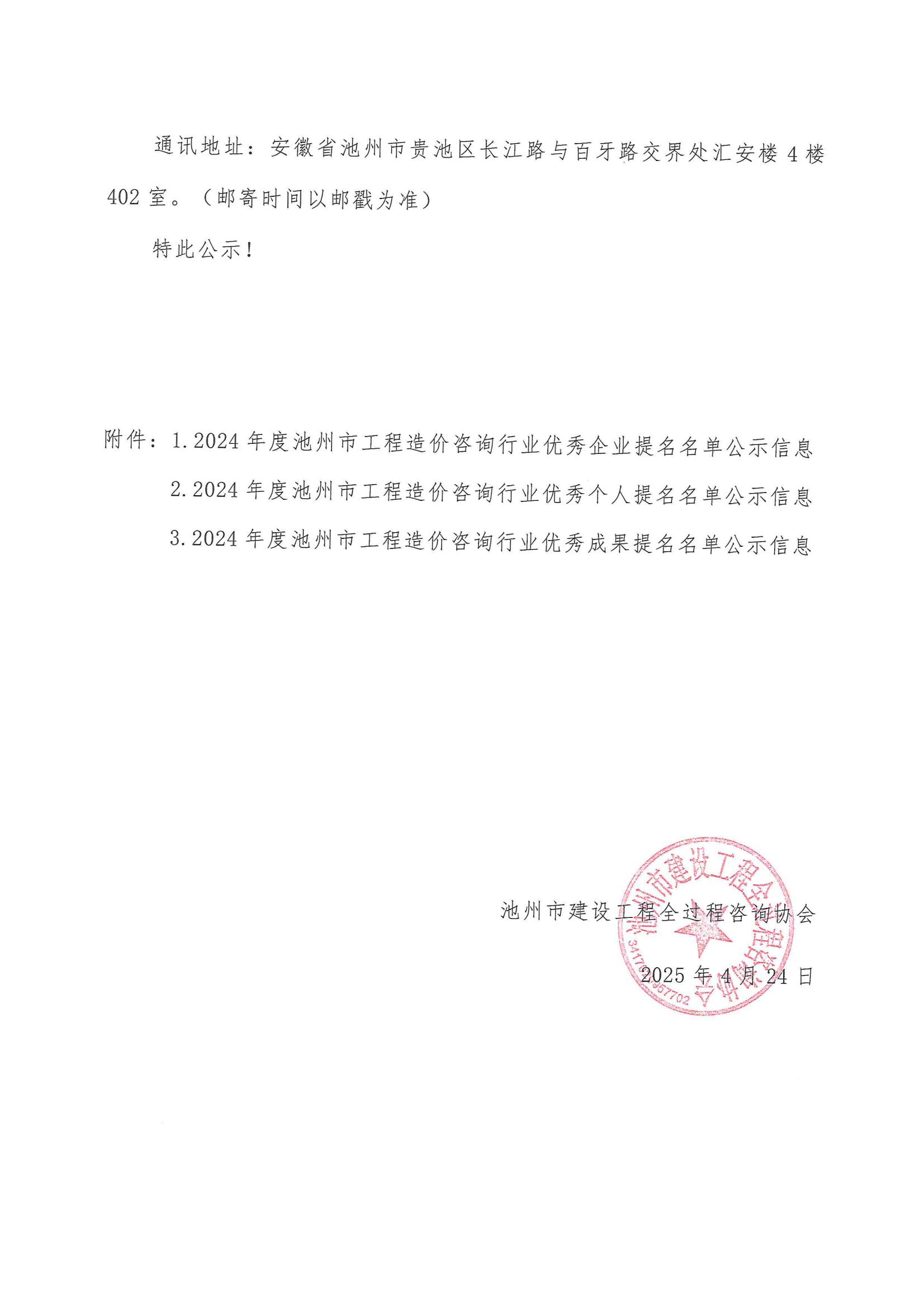 关于2024年度池州市工程造价咨询行业优秀企业、个人和优秀成果认定名单的公示