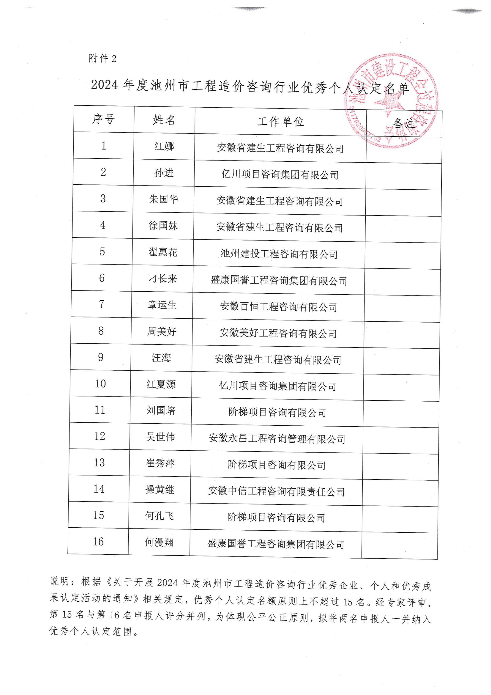 关于2024年度池州市工程造价咨询行业优秀企业、个人和优秀成果认定名单的公示