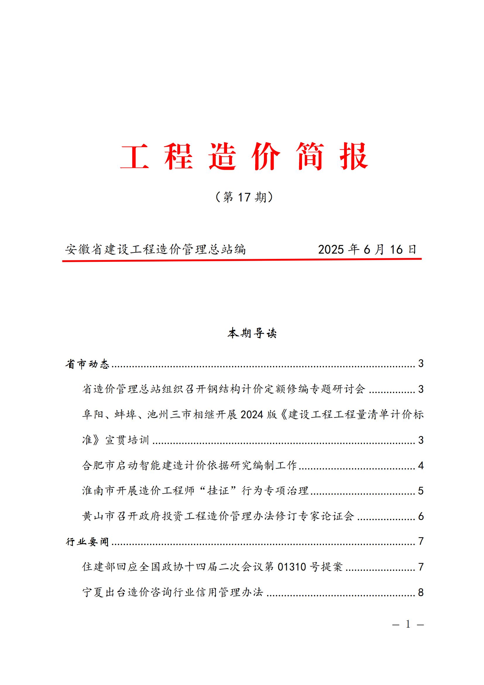 安徽省建设工程造价管理总站《工程造价简报》第17期