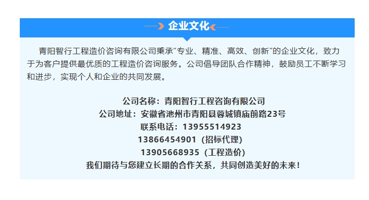 青阳智行工程咨询有限公司,自2020年成立以来,始终致力于提供高质量的工程造价咨询及招标代理服务。凭借多年的积累和发展,公司已成为业内知名的专业造价咨询机构。