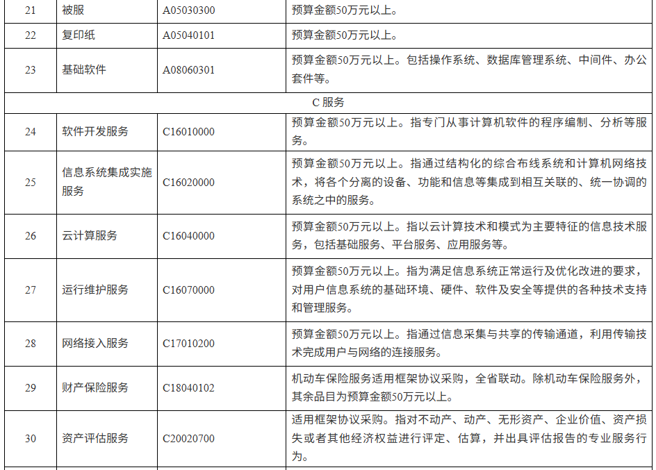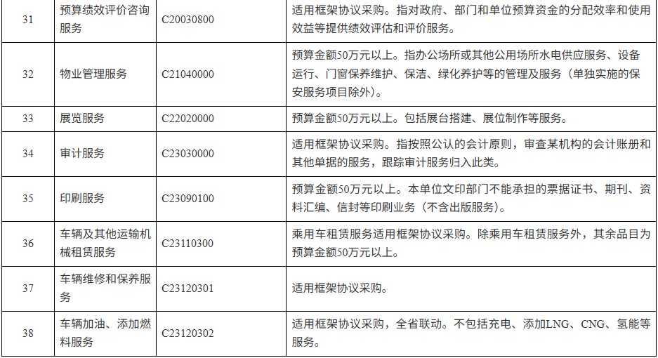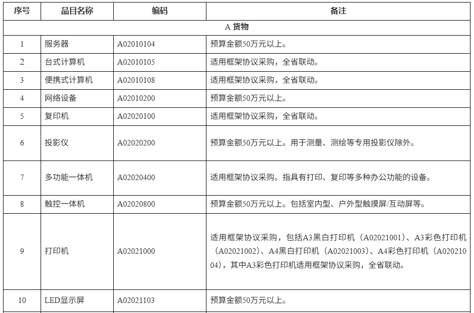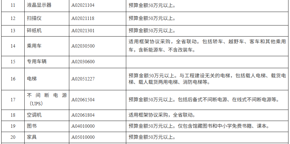 注:①表中所列项目不包括高校、科研机构所采购的科研仪器设备。②集中采购目录的品目名称、编码及说明按照《政府采购品目分类目录》(财库〔2022〕31号)执行和解释。③表中注明“预算金额50万元以上”,是指该品目年度累计采购预算达50万元以上,应委托集中采购机构依法组织项目采购。④表中未注明预算金额也未注明适用框架协议的品目,应委托集中采购机构依法组织项目采购。⑤表中所称“以上”均包含本数,下同。