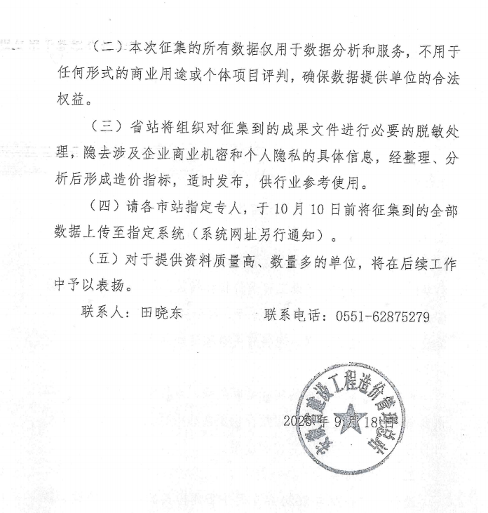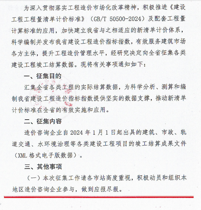 根据安徽省建设工程造价管理总站《关于组织征集建设工程竣工结算数据的通知》要求,需报送自 2024 年 1 月 1 日起出具的建筑、市政、轨道交通、水环境治理等各类建设工程项目的竣工结算成果文件(XML 格式电子版数据),请于10月8日前报送数据至PA视讯;本次征集数据仅用于数据分析和服务,会进行脱敏处理以保护企业商业机密与个人隐私,提供资料质量高、数量多的单位将在后续工作中被表扬。