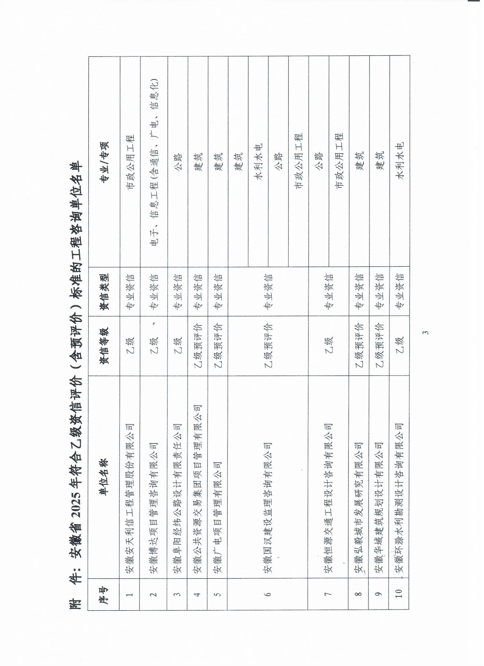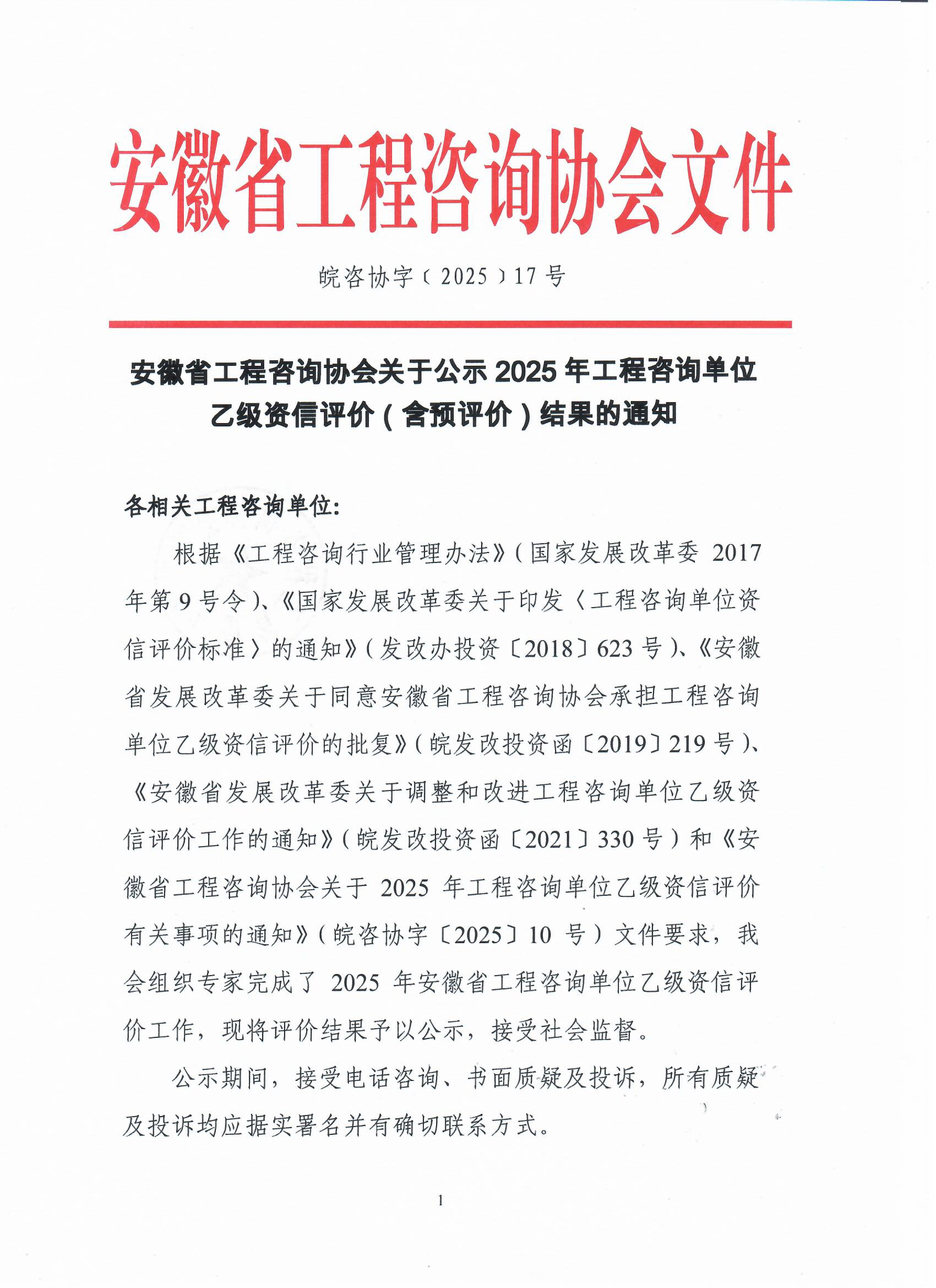 安徽省工程咨询PA视讯关于公示2025年工程咨询单位乙级资信评价(含预评价)结果的通知