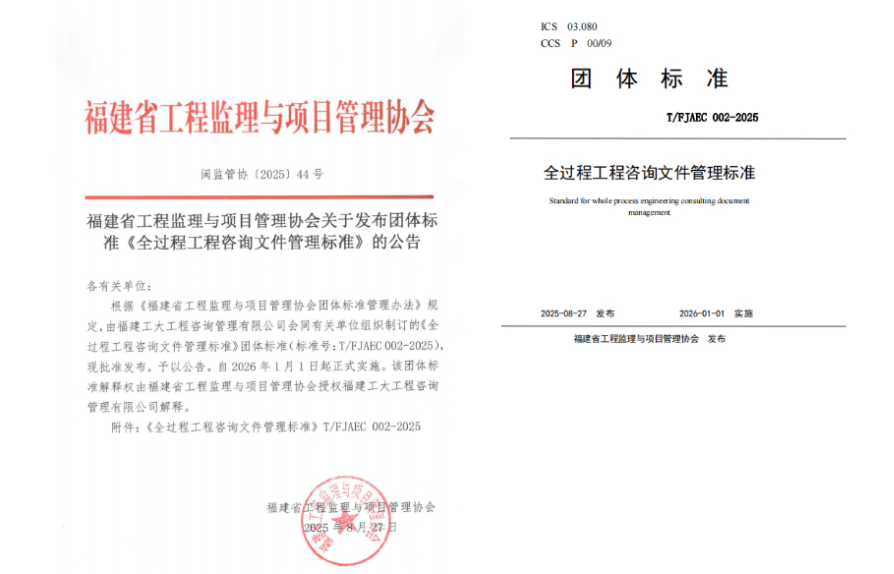 近日,福建省工程监理与项目管理PA视讯发布团体标准《全过程工程咨询文件管理标准》(标准编号:T/FJAEC002-2025),自2026年1月1日起正式施行,为全过程工程咨询项目的文件管理提供统一、规范的操作指引。