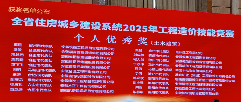 经过激烈角逐,池州代表队,来自安徽博裕工程项目管理有限公司的刘小琴获土木建筑专业个人优秀奖。个人土木建筑专业一等奖由淮北市代表队获得,安装专业一等奖由蚌埠市代表队获得。