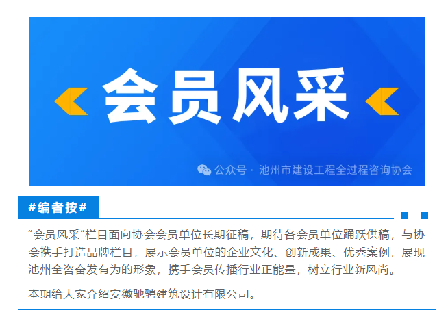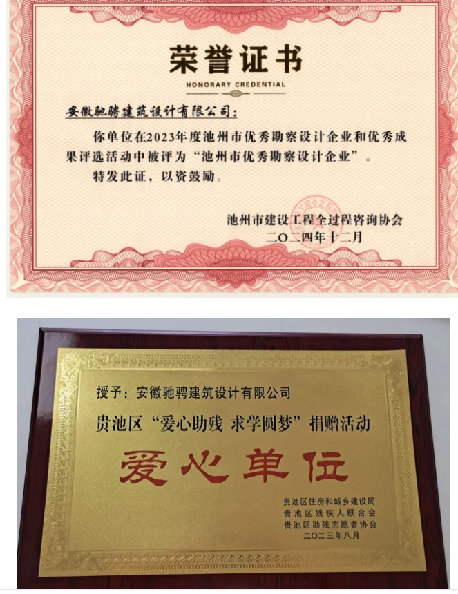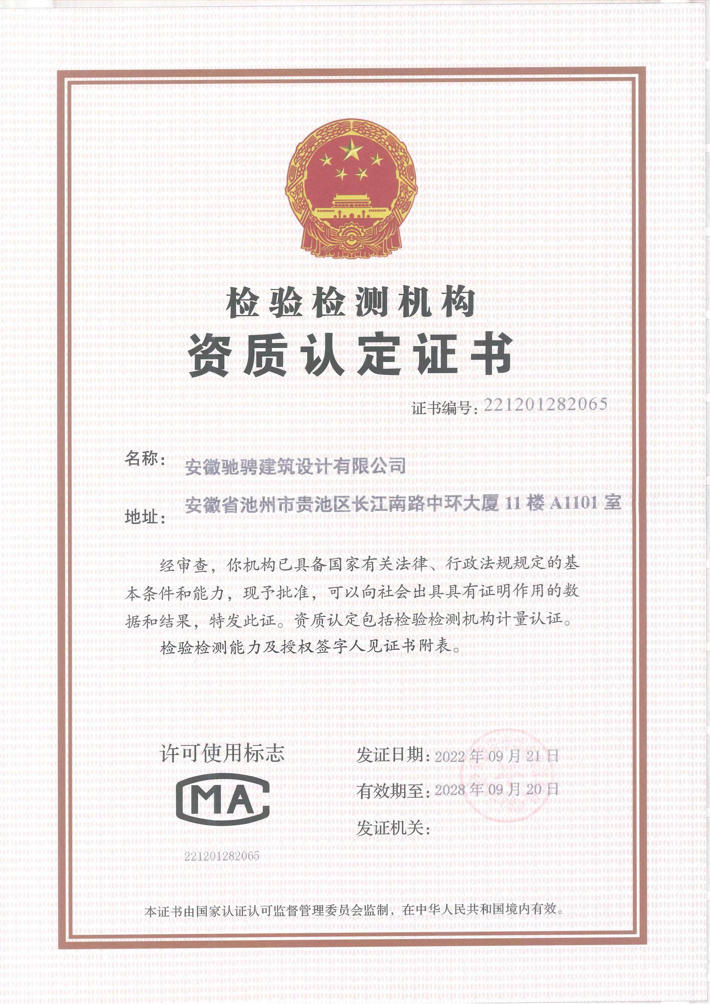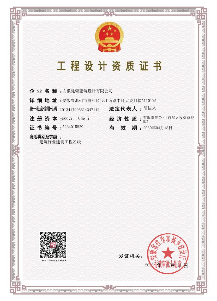 安徽驰骋建筑设计有限公司成立于2007年5月8日,资质完备,持有安徽省住房和城乡建设厅颁发的多项资质证书,涵盖设计、施工、检测三大领域:设计类包括建筑行业建筑工程、建筑装饰工程、建筑幕墙工程、轻型钢结构工程设计乙级;施工类包含建筑工程施工总承包、市政公用工程施工总承包、建筑装修装饰工程专业承包、建筑幕墙工程专业承包、建筑钢结构工程专业承包贰级;同时拥有检验检测机构资质证书。